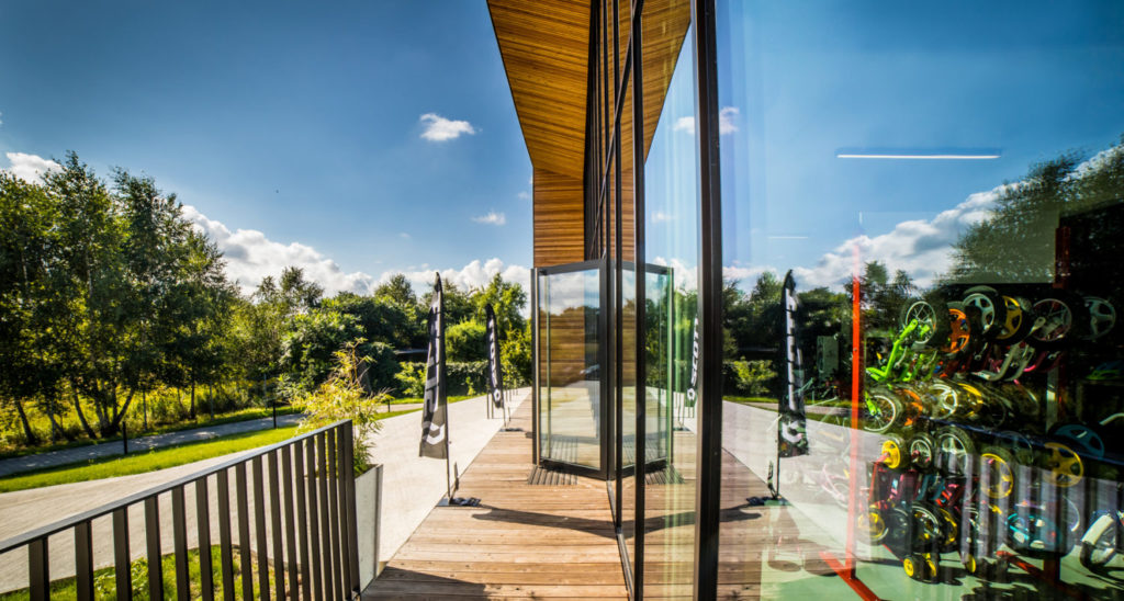 Ten obiekt projektowaliśmy jak precyzyjne narzędzie do sprzedaży i obsługi klienta — miejsce, które ma pracować codziennie: eksponować produkt, prowadzić użytkownika intuicyjną ścieżką i budować zaufanie do marki. Zależało nam na architekturze bez zbędnych gestów, ale z wyrazistą tożsamością: nowoczesnej, technicznej i jednocześnie ciepłej w odbiorze. Bryła jest prosta i konsekwentna — jak dobrze zaprojektowany sprzęt. Najbardziej charakterystycznym elementem jest wielkoformatowa, przeszklona fasada, która otwiera wnętrze na otoczenie i zamienia ekspozycję w „żywą witrynę”. W dzień odbija niebo i krajobraz, a po zmroku staje się latarnią: pokazuje rytm pracy obiektu i jego energię. Dla równowagi wprowadziliśmy akcenty drewna w głębi ramy elewacyjnej i w podbitce — detal, który ociepla industrialny charakter i podkreśla precyzję kompozycji.