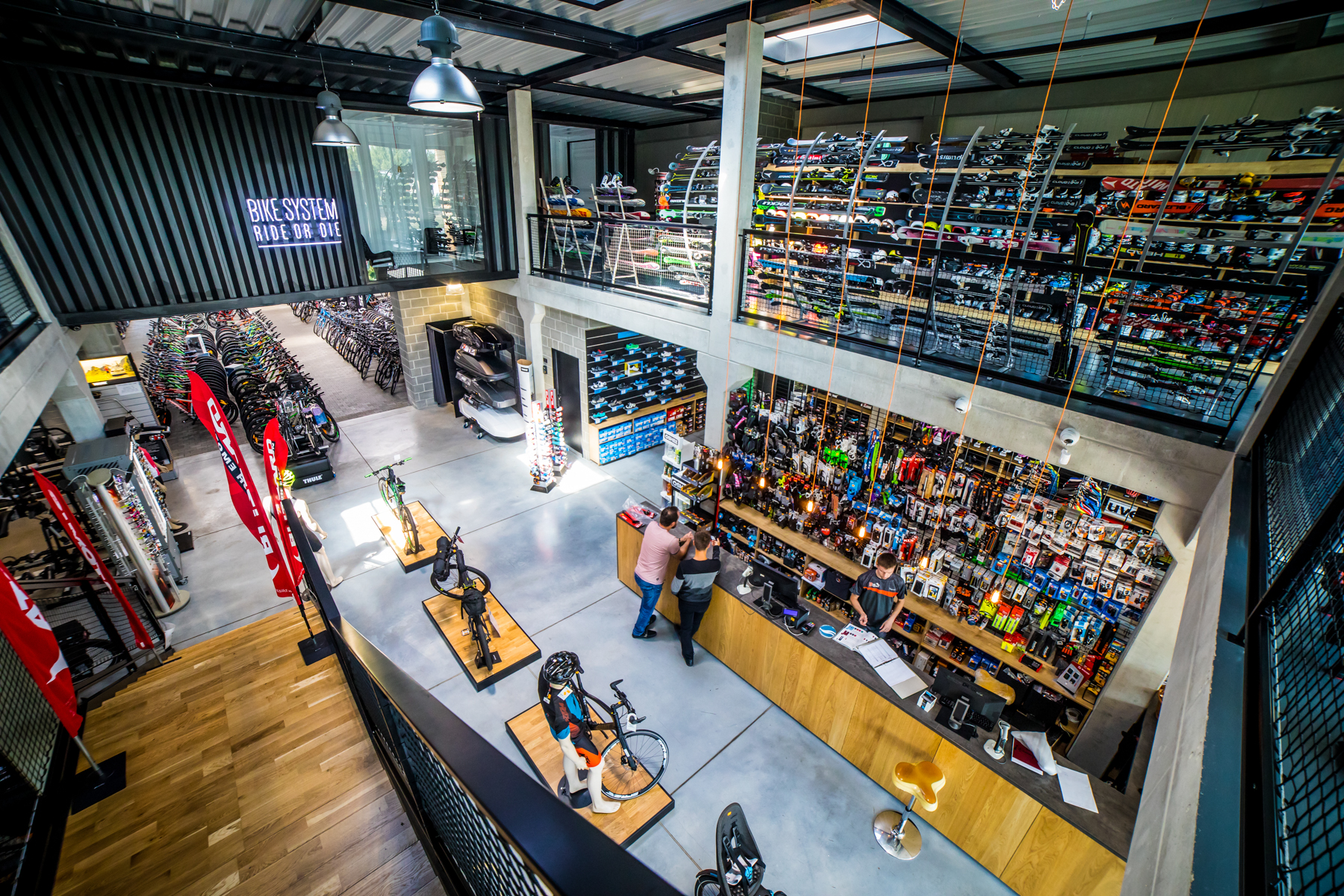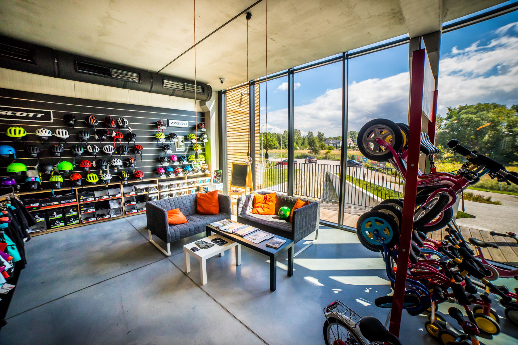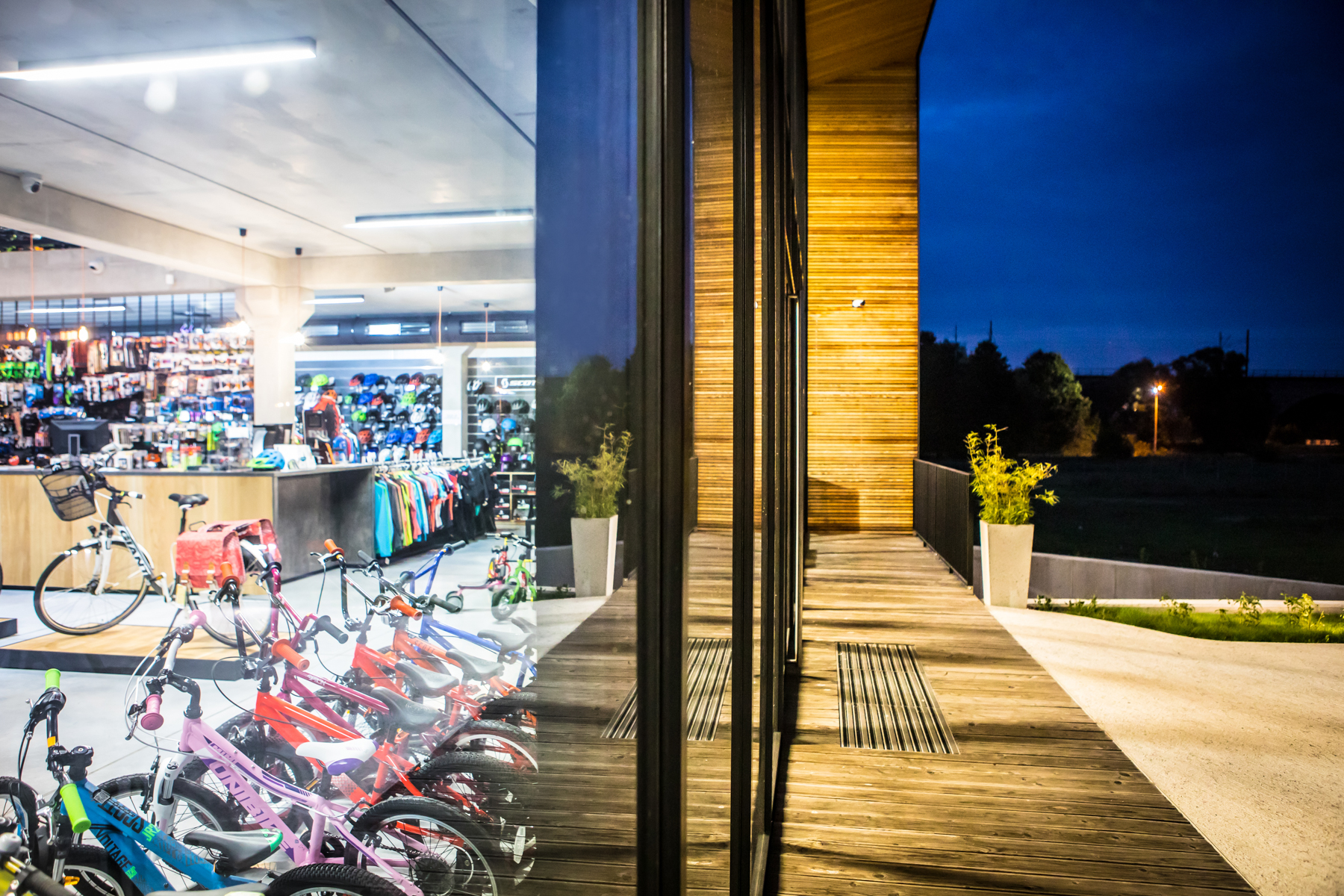 W sercu zaplecza wprowadziliśmy element, który świetnie pasuje do charakteru miejsca: kontener morski wykorzystany jako strefa biurowo–szatniowa. To rozwiązanie jest jednocześnie praktyczne i symboliczne — kontener wnosi do wnętrza skojarzenia z logistyką, mobilnością i technicznym światem sprzętu, a przy tym porządkuje funkcje, które zwykle „rozlewają się” po obiekcie: biuro, szatnie, magazyn podręczny. Dzięki temu zaplecze stało się zwarte i czytelne, a przestrzeń sprzedaży pozostała maksymalnie otwarta. To przykład projektowania, które szuka prostych, mocnych odpowiedzi — zamiast komplikować, systematyzuje. Ten obiekt pokazuje, że architektura komercyjna może być jednocześnie racjonalna i charakterystyczna. Zbudowana z prostych środków, ale dopracowana w detalu. Surowa, ale przyjazna. Taka, która nie starzeje się po sezonie — bo jej siłą jest logika konstrukcji, światło i konsekwencja materiałowa.