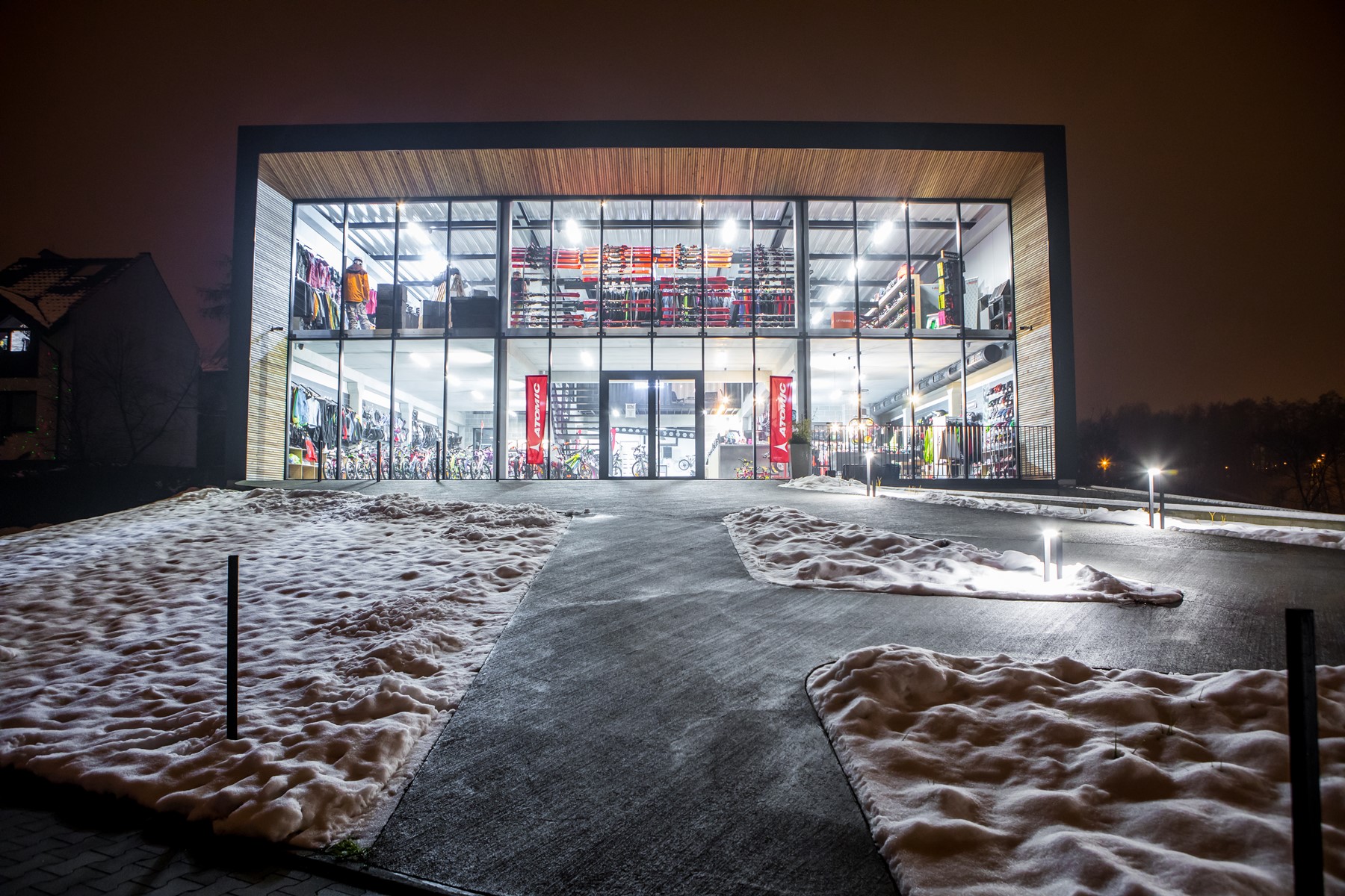 Ten obiekt projektowaliśmy jak precyzyjne narzędzie do sprzedaży i obsługi klienta — miejsce, które ma pracować codziennie: eksponować produkt, prowadzić użytkownika intuicyjną ścieżką i budować zaufanie do marki. Zależało nam na architekturze bez zbędnych gestów, ale z wyrazistą tożsamością: nowoczesnej, technicznej i jednocześnie ciepłej w odbiorze. Bryła jest prosta i konsekwentna — jak dobrze zaprojektowany sprzęt. Najbardziej charakterystycznym elementem jest wielkoformatowa, przeszklona fasada, która otwiera wnętrze na otoczenie i zamienia ekspozycję w „żywą witrynę”. W dzień odbija niebo i krajobraz, a po zmroku staje się latarnią: pokazuje rytm pracy obiektu i jego energię. Dla równowagi wprowadziliśmy akcenty drewna w głębi ramy elewacyjnej i w podbitce — detal, który ociepla industrialny charakter i podkreśla precyzję kompozycji.