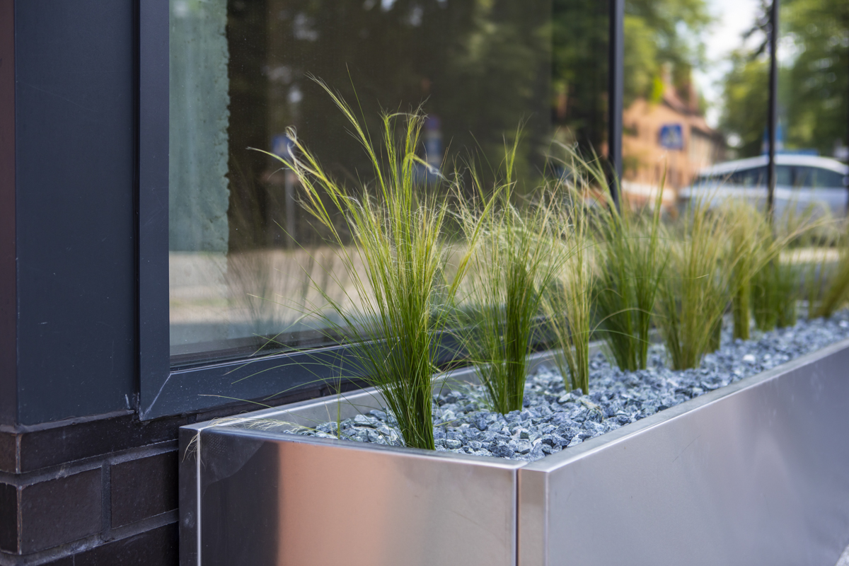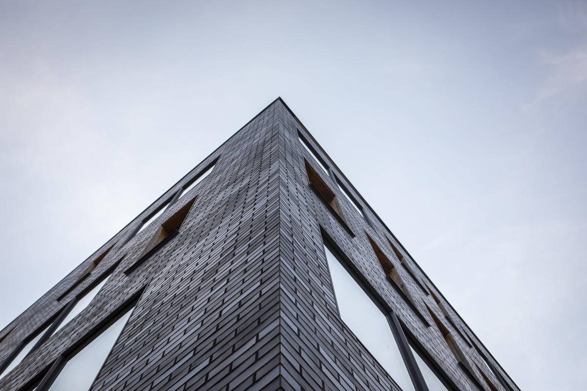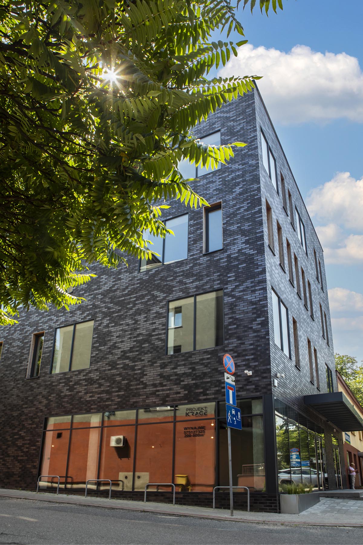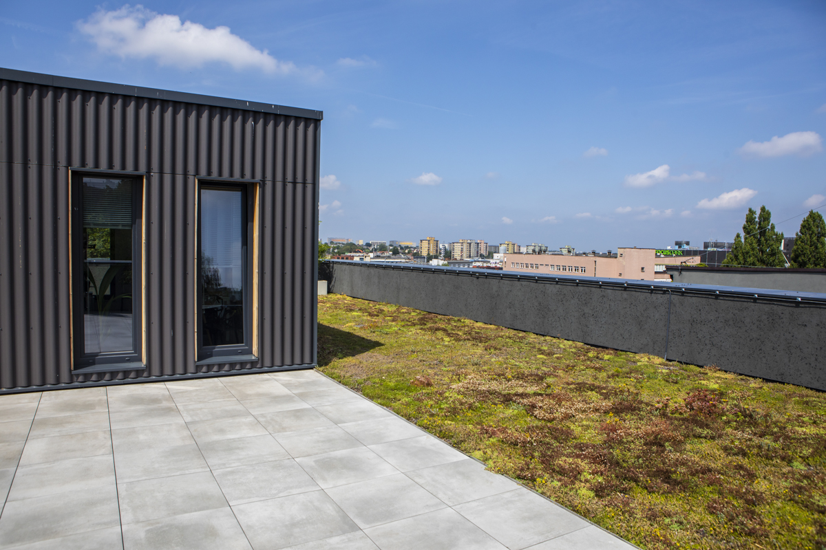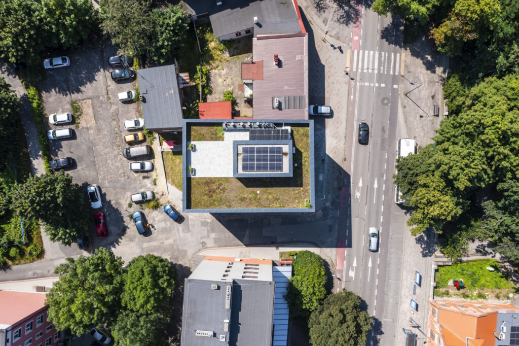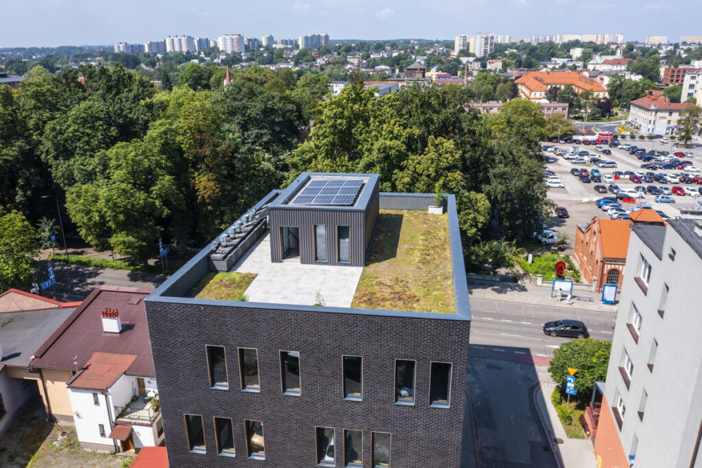 Od strony architektonicznej budynek opiera się na konsekwencji materiału i detalu. Elewację wykonano z klinkieru – materiału trwałego, odpornego i „bezpiecznego” w czasie, co ma znaczenie w obiektach na wynajem. Rytm okien i głębie ościeży budują wrażenie solidności, a jednocześnie nadają bryle nowoczesny, miejski charakter. Na szczycie budynku zaprojektowano dach zielony z tarasem, traktowany jako realne udogodnienie, a nie „ozdoba”. To przestrzeń odpoczynku, spotkań i pracy w plenerze – z widokiem na miasto. W segmencie najmu takie elementy coraz częściej przesądzają o przewadze konkurencyjnej budynku: poprawiają komfort użytkowników i wzmacniają wizerunek firmy wynajmującej powierzchnię. Przyrodniczo dach zielony jest niezastąpionym elementem minimalizującym negatywny wpływ zabudowy na środowisko naturalne.