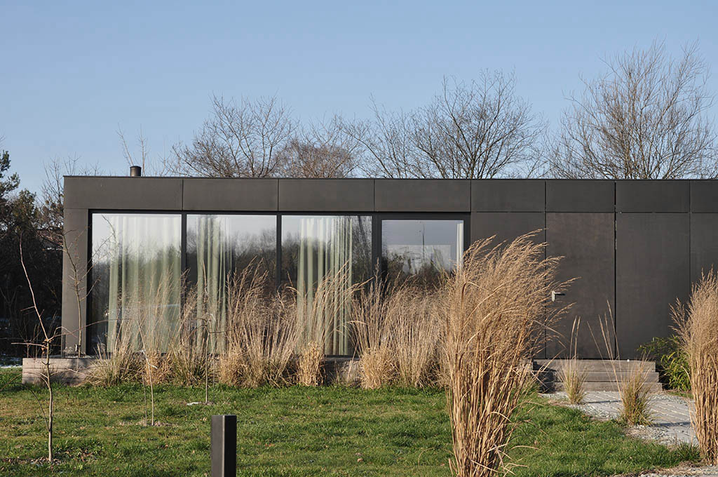 To dom, który w dzień jest spokojny i zdyscyplinowany, a wieczorem zamienia się w jasną, ciepłą przestrzeń – szczególnie widać to na zdjęciach „po zmroku”, gdzie wnętrze pracuje jak latarnia w krajobrazie.