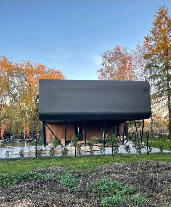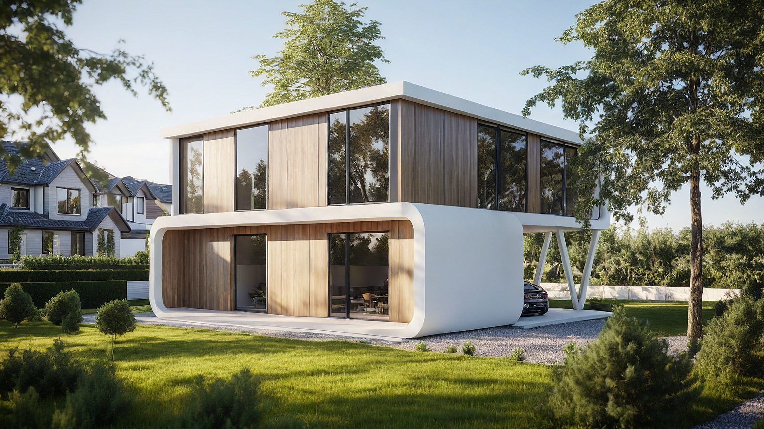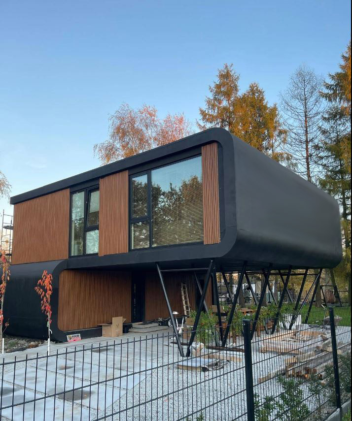 Projekt pierwotnie został zaplanowany w jasnej, białej kolorystyce, która podkreślała rzeźbiarską formę i miękkie zaokrąglenia narożników. W realizacji inwestor zdecydował się na wersję czarną, bardziej graficzną i kontrastową. Ta zmiana nie zaburzyła jednak głównej idei: dom nadal pozostaje „lekki” dzięki nadwieszeniu, a jego charakter buduje połączenie gładkiej bryły, drewnianych wstawek oraz konstrukcji o czytelnej geometrii.